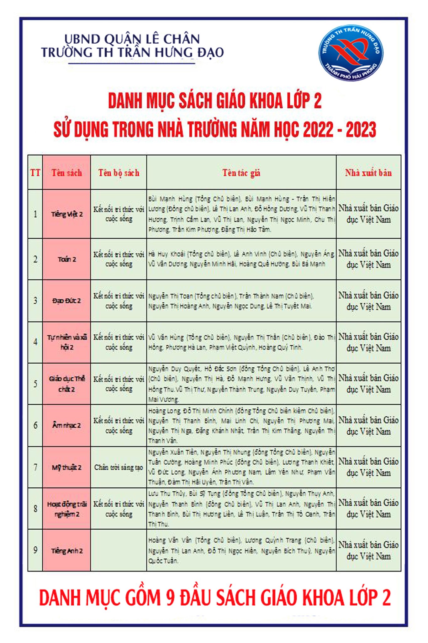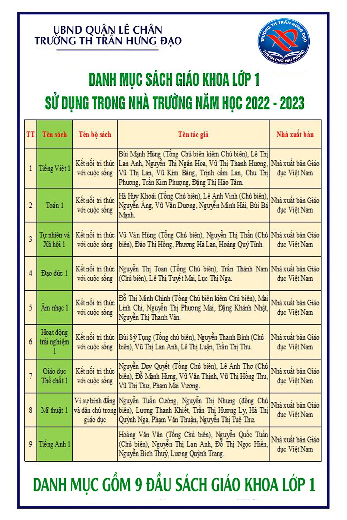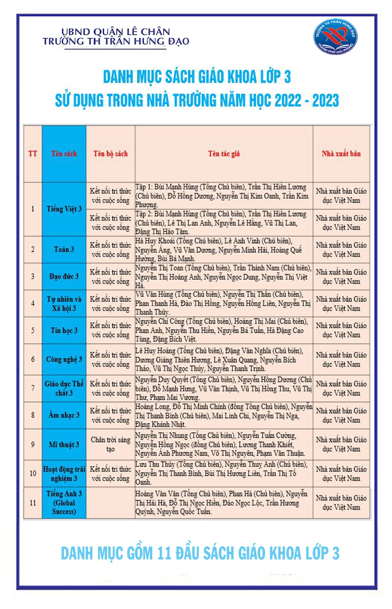Thực hiện Thông tư số 25/2020/TT-BGDĐT ngày 26/8/2020 của Bộ GD&ĐT quy định việc lựa chọn sách giáo khoa trong cơ sở giáo dục phổ thông; Căn cứ danh mục SGK lớp 1, lớp 2, lớp 3 đã được UBND thành phố phê duyệt tại các quyết định số 1089/QĐ-UBND ngày 14/4/2021 và quyết định số 1281/QĐ-UBND ngày 04/5/2022, Trường Tiểu học Trần Hưng Đạo trân trọng thông báo tới toàn thể cán bộ, giáo viên, nhân viên, cha mẹ học sinh và các em học sinh danh mục Sách giáo khoa lớp 1, 2, 3 nhà trường lựa chọn để thực hiện giảng dạy trong năm học 2022 - 2023 như sau: