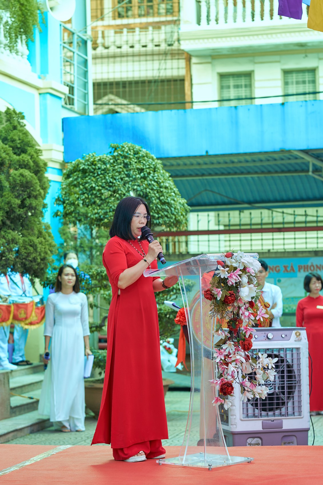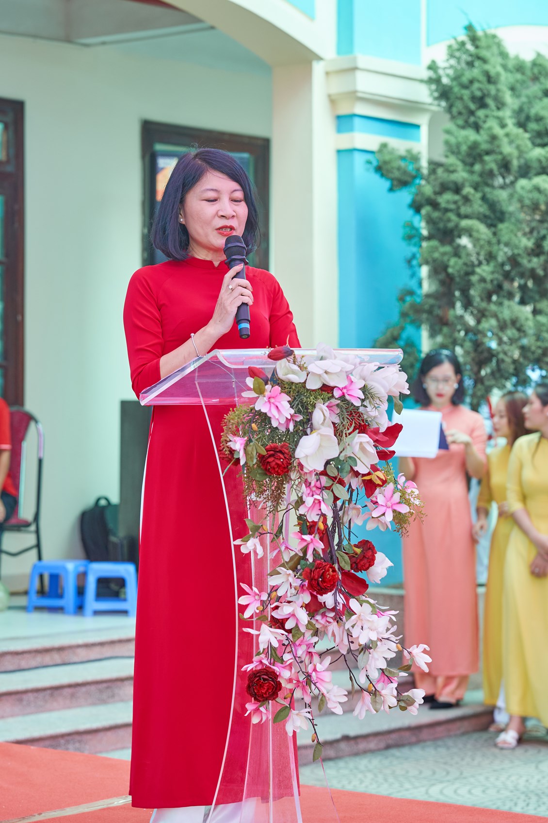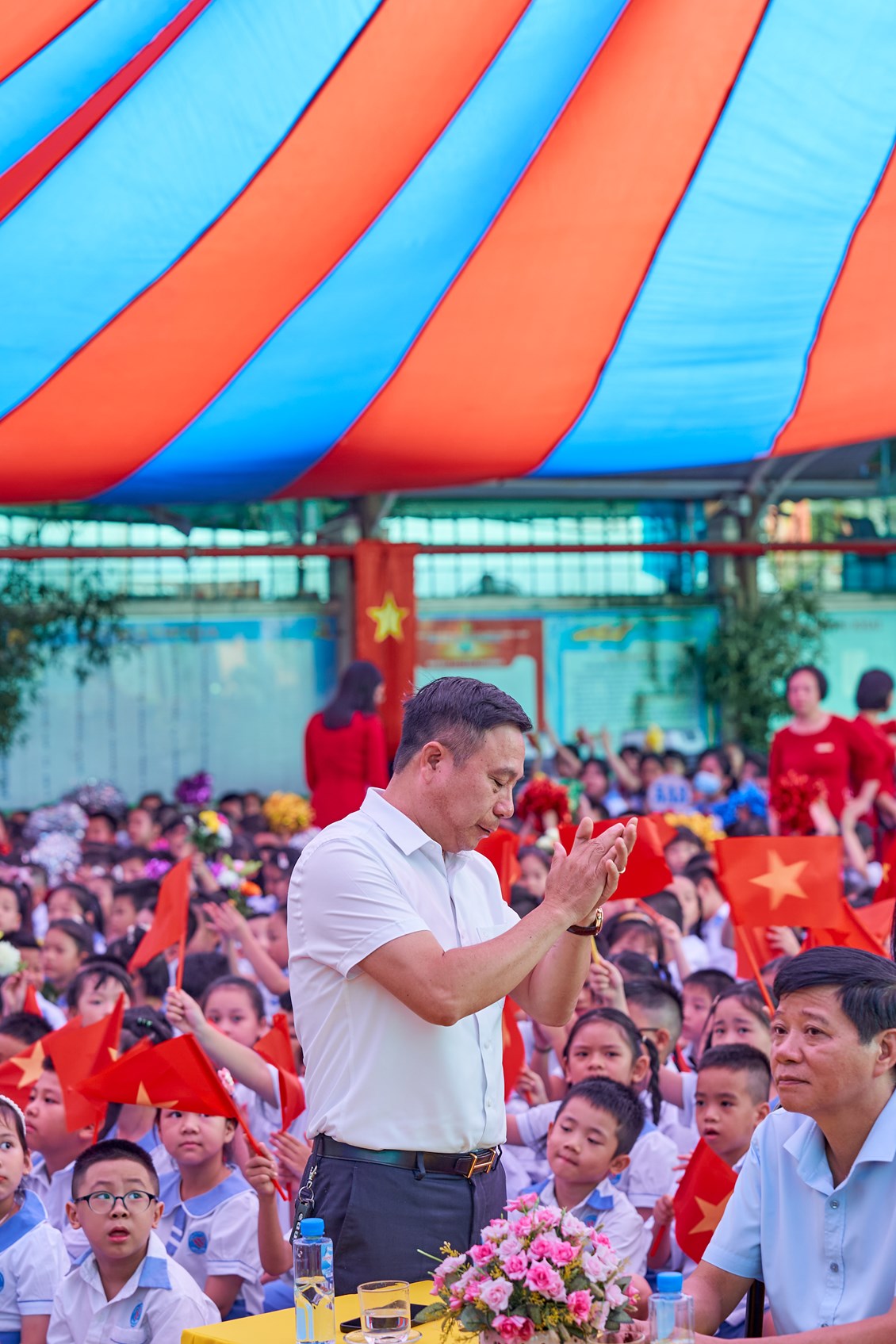 ☀️Ngay sau phần giới thiệu đại biểu, Nhà giáo Nguyễn Thị Kim Viên - Bí thư chi bộ, Hiệu Trưởng nhà trường lên đọc diễn văn Khai giảng năm học 2023 - 2024 và nhận những lẵng hoa tươi thắm từ các cấp lãnh đạo.